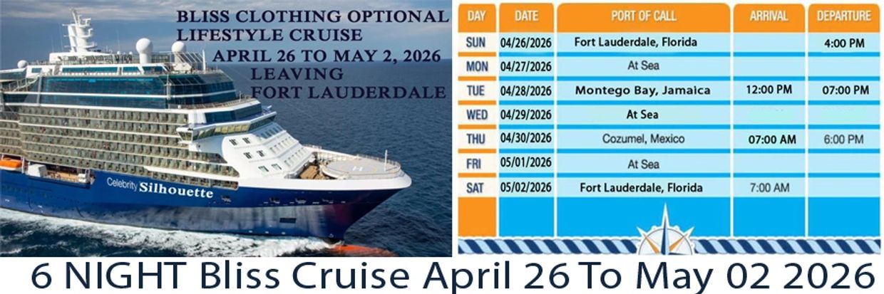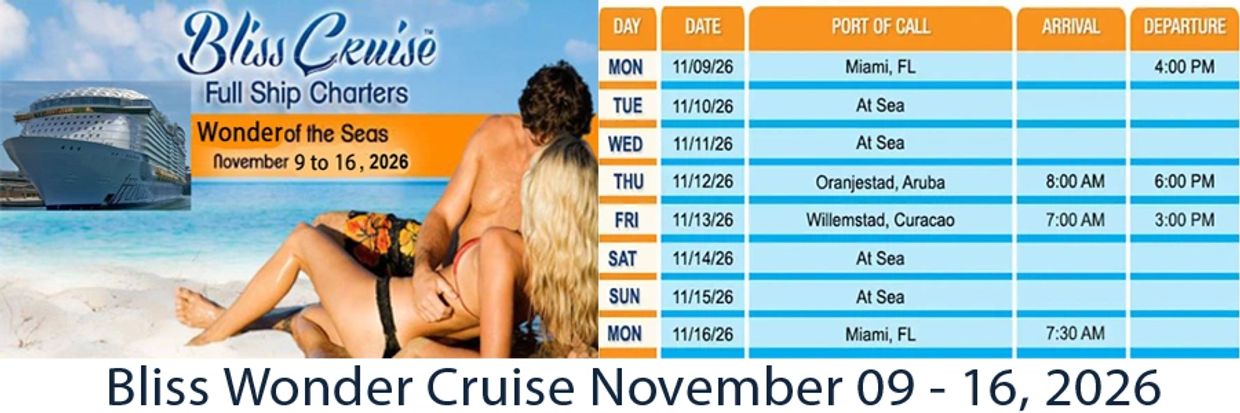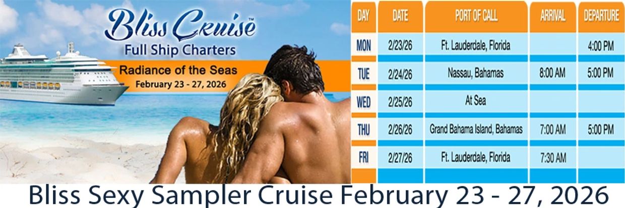 Special Introductory Rate $625 per Person: It's the perfect way to sample a Bliss Experience with a short (party your brains out) 5-day/4-night cruise. Enjoy playrooms, seminars, meet & greets, and best of all -- it's just $625/person base cost for an Inside Cabin + taxes/fees. After 4 nights and 1 day at sea, where the pool decks are all clothing optional, spend one day winding down in Grand Bahama Island.